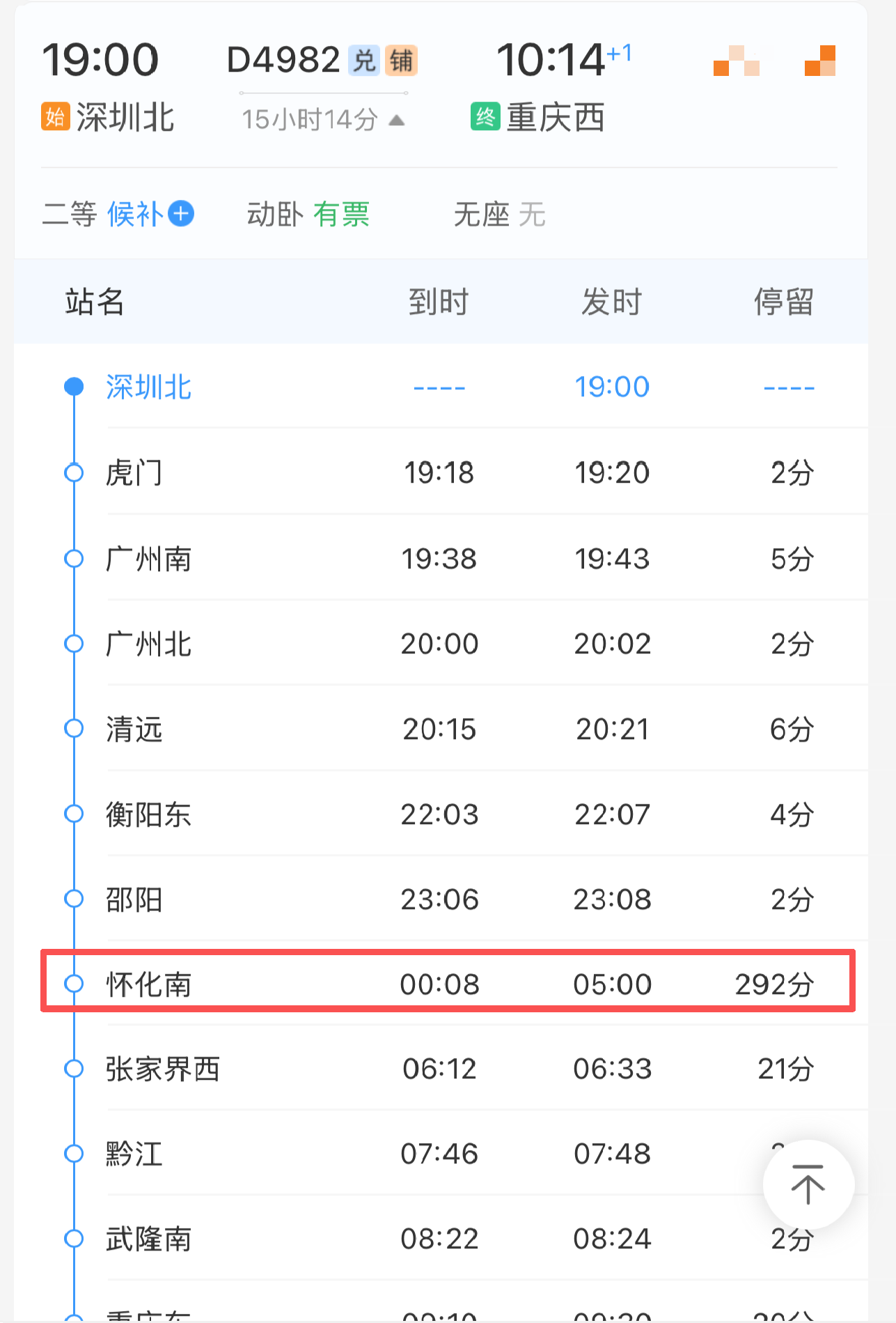 △怀化南站显示停留292分钟